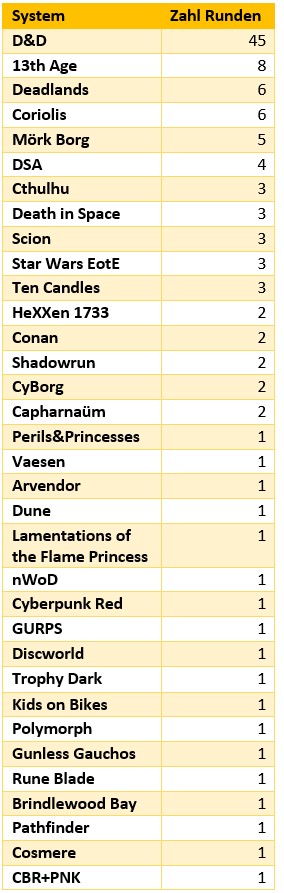 Bei den angebotenen Systemen hat sich der Trend der letzten Zeit ins Extreme verstärkt. D&D liegt einsam und übermächtig an der Spitze. Kein anderes System kann da auch nur annährend in diesen Kategorien mithalten. Während hier bald 50 Runden erreicht werden, kommen die anderen Angebote nicht mal auf zweistellige Werte.