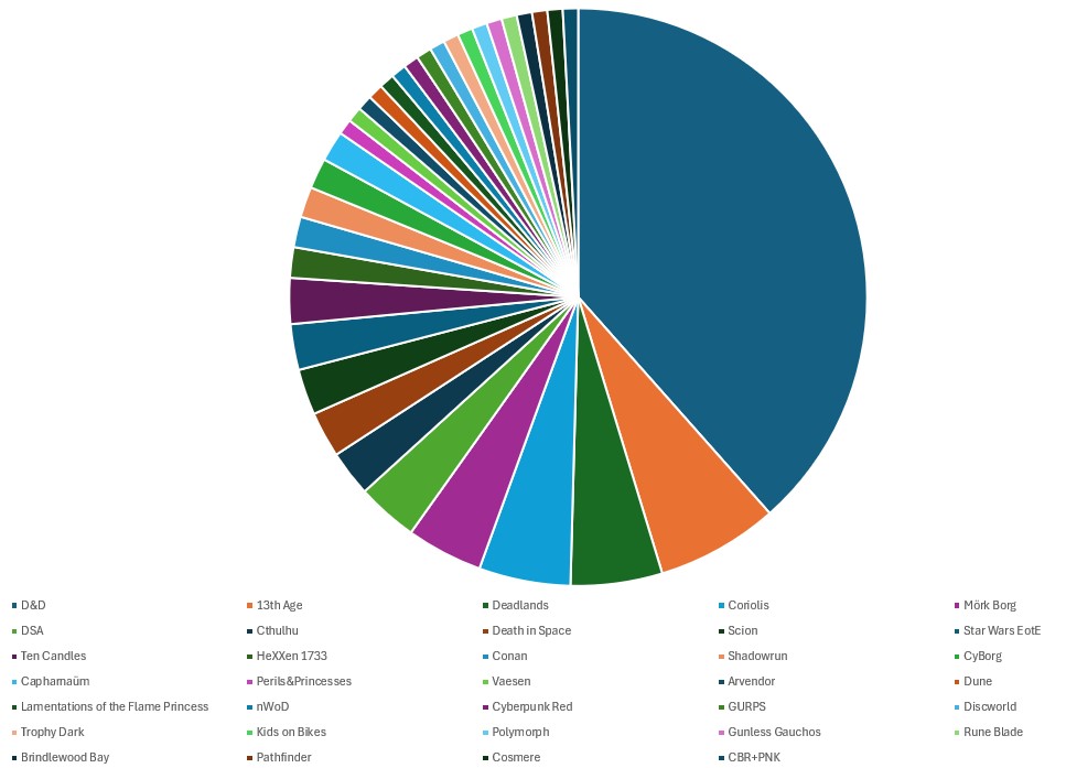 Das Tortendiagramm liefert hier aber nochmal wichtige Erkenntnisse. Obwohl es kein System gibt, dass vom Umfang her irgendwie in der gleichen Liga spielt ist dennoch erkennbar, dass die angebotene Vielfalt sehr hoch ist. Neben der Tatsache, dass viel D&D angeboten wird, spielt auch der Umstand mit rein, dass sich einige hochfrequente D&D-Runden gefunden haben, was die Zahlen für dieses System schnell hat ansteigen lassen.